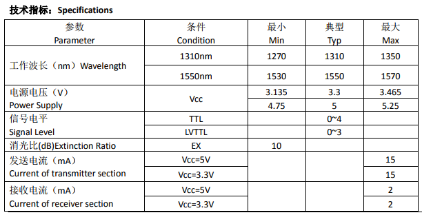 ● 发射器件工作波长可分别选用 1310nm FP 和 1550nm FP 激光器