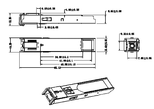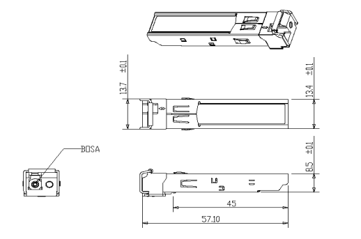 SFP-BIDI光模块是高性能、高性价比的模块,支持 1.25Gbps/1.0625Gbps 双数据速率和 20km 的 SMF 传输距离。光模块由三部分组成:FP激光发射器、集成了跨阻前置放大器(TIA)的PIN光电二极管和MCU控制单元。所有模块均满足 I 级激光安全要求。光模块与 SFP 多源协议 (MSA) 和 SFF-8472 兼容。欲了解更多信息,请参阅SFP MSA。