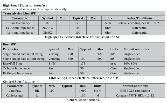 该模块支持具有5电平脉冲幅度调制(PAM)信号的1000 Mbps全双工数据链路,电缆有四对线,每对线的符号速率为250Mbps。该模块提供标准的符合SFP MSA的串行ID信息,可通过2线串行CMOS以A0h地址访问EEPROM协议。物理IC也可以通过地址ACh处的2线串行总线访问。