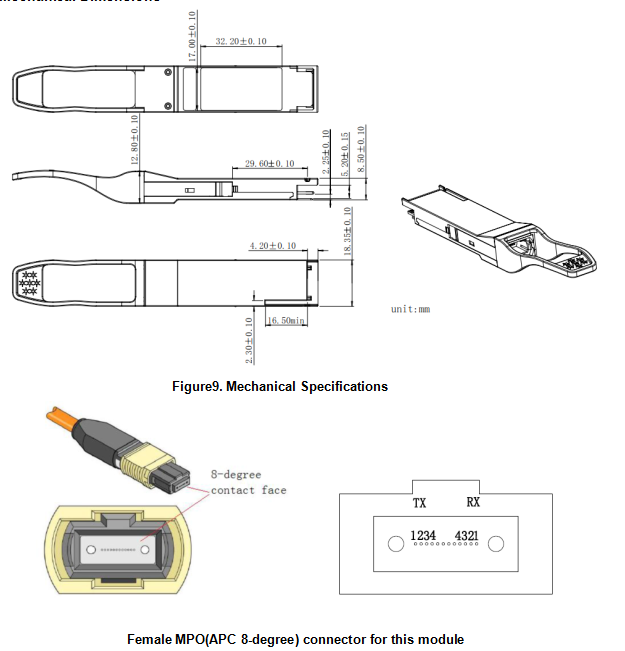 100Gb/s QSFP28 PSM4, MPO Connector, reach 10km on G.652 , -40~85℃ |