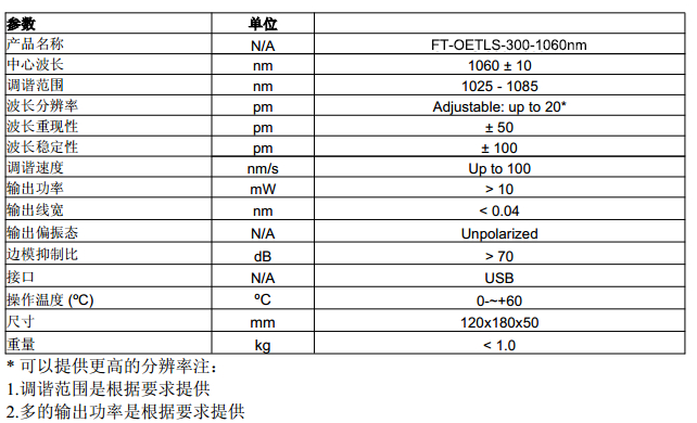 产品型号 FT-OEETLS-300-1060nm,这个结构紧凑的,坚固耐用的激光器提供高输出功率,高边模抑制比(SMSR)和良好的线性波长扫描,它也可以是一个具有低成本的OEM模块作为系统集成为了实验室目的和工业应用。