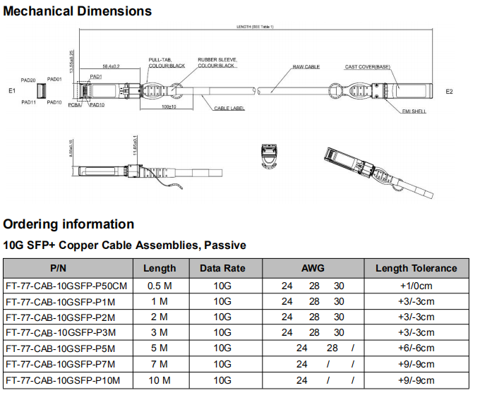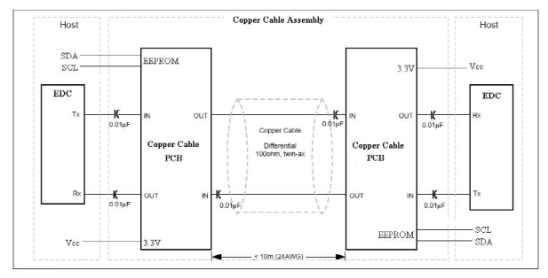 The passive SFP+ Direct attach copper cable assembly is a low cost alternative for short reach applications. The design allows for a serial data transmission up to 12Gbps in each direction. The passive design has no signal amplification in the cable assembly. Electronic Dispersion Compensation (EDC) is typically used on host board designs when passive copper cable assemblies are utilized. EDC allows for an extended length of passive cable assemblies. EEPROM signature enables the host to differentiate between a passive copper cable assembly and a fiber optic module. The mechanical design of the braid crimp and EMI skirt ensure that EMI radiation is sufficiently suppressed. Additionally, the copper cable acts