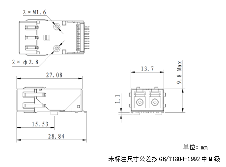 此光模块产品集成了发射部分和接收部分。发射部分采用单路1310nm波段光发射组件将输入的差分电信号转换成光信号,差分电信号标准为CML电平。接收部分采用单路1310nm波段光接收组件将接收的光信号转换成差分电信号,输出电信号接口电平标准为CML。发射通道和接收通道工作速率可达10.3125bps并向下兼容,光接口为可插拔的标准LC连接器接口。