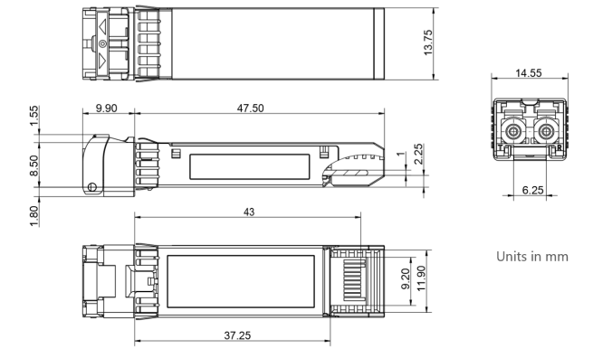 FTCS-Dxx1X-H0Dxx transceivers provide a unique enhanced digital diagnostic monitoring interface, which allows real-time access to device operating parameters such as transceiver temperature, laser bias current, transmitted optical power, and received optical power and transceiver supply voltage. It also defines a sophisticated system of alarm and warning flags, which alerts end-users when particular operating parameters are outside of a factory set normal range.