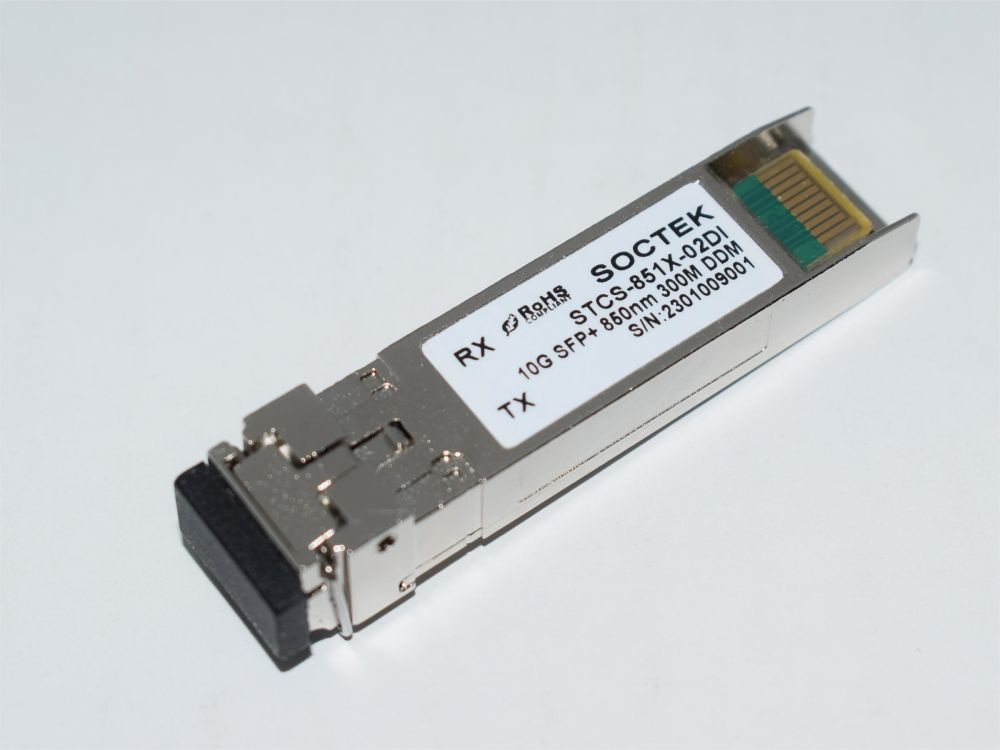 SFP+ SR 模块电气接口符合 SFI 电气规范。发射器输入和接收器输出阻抗相差 100 欧姆。数据线内部交流耦合。该模块提供差分端接,并减少差分到共模转换,以实现高质量的信号端接和低 EMI。SFI 通常使用超过 200 毫米的改良 FR4 材料或高达约 150 毫米的标准 FR4 和一个连接器。发射器将 10Gbit/s 串行 CML 电气数据转换为符合 10GBASE-SR 标准的串行光学数据。提供集电极开路兼容发射禁用(TxDis)。逻辑“1”或该引脚无连接将禁止激光发射。此引脚上的逻辑“0”提供正常操作。该发射机具有内部自动功率控制环路(APC ),以确保在电源电压和温度变化时恒定的光功率输出。提供集电极开路兼容发送故障(t Fault)。TXFault 是一个模块输出触点,当该触点为高电平时,表示模块发射器已检测到与激光操作或安全相关的故障情况。TXFault 输出触点是开漏/集电极,应通过 4.7-10kω范围内的电阻上拉至主机中的 VccHost。TXDisable 是一个模块输入触点。当 TXDisable 置位为高电平或保持开路时,SFP+模块发射器输出应关闭。此触点应通过一个 4.7kω至 10kω的电阻上拉至 VccT。接收器将 10Gbit/s 串行光数据转换为串行 CML 电数据。提供了集电极开路兼容的信号损失。RxLOS 为高电平时,表示光信号电平低于相关标准中规定的电平。RxLOS 触点是开漏/集电极输出,应通过 4.7-10kω范围内的电阻或有源端接在上拉至主机中的 VccHost。建议发射器和接收器都采用电源滤波。RxLOS 信号旨在向安装了 SFP+的系统提供初步指示,表明接收信号强度低于规定范围。这种指示通常指向未安装的电缆、断裂的电缆、或在电缆远端的禁用的、故障的或断电的发射器。