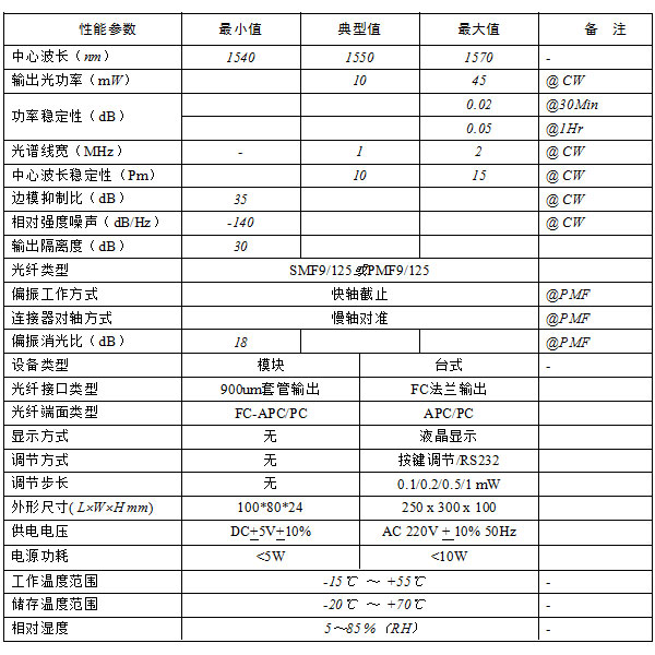 分布反馈式激光器 超窄线宽(典型值1MHz) 高输出功率 极低相对强度噪声 保偏或单模尾纤输出 高偏振消光比 优异边模抑制比 线性温控电路 可提供模块及台式 |