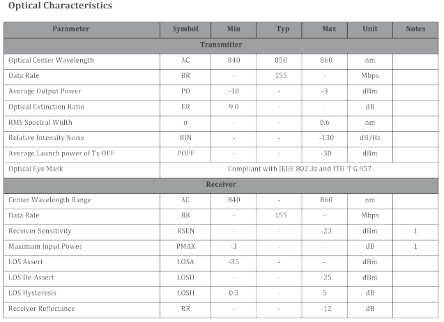 155M/1.25G SFP 850nm光模块由三部分组成:850nm VCSEL激光发射机,一个集成了跨阻抗的PIN光电二极管前置放大器(TIA)和MCU控制单元。所有模块均满足I级激光安全要求。155M/1.25G SFP 850nm光模块与SFP多源协议和SFF-8472数字诊断功能兼容。