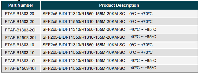 F-tone’s FTAF-B1X03-XX Small Form Factor (SFF) transceivers comply with the 2×5 standard package defined by the Small Form Factor Multi-Sourcing Agreement (MSA). They also comply with SONET OC-3 SR-1/IR-1 (SDH STM I-1/S-1.1) standards2.