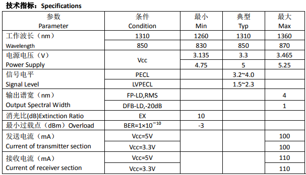 ● 发射器件可选用 1310nm 的 FP 激光器或 850nm VCSEL 激光器