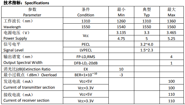 ● 发射器件可选用 1310nm 的 FP 激光器或 1550 DFB 激光器