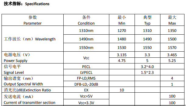 ● 发射器件可分别选用 1310nm FP 或 1490nmDFB 或 1550nm DFB