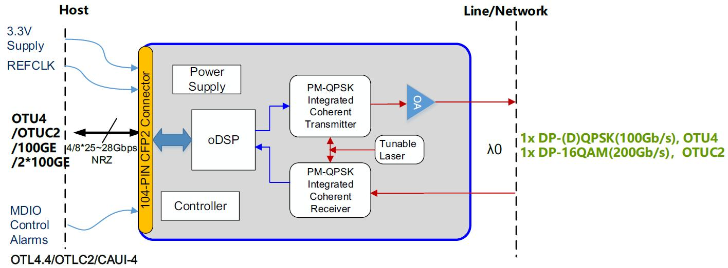 200G/100G, PM-16QAM/PM-DQPSK/PM-QPSK, Coherent CFP2 |
