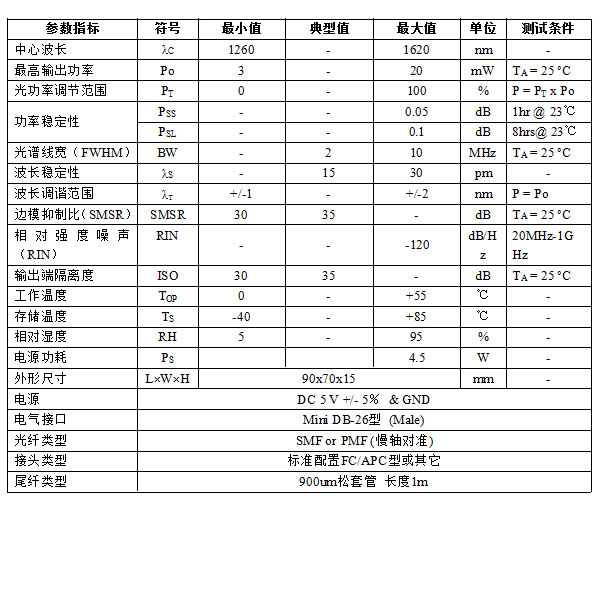 分布反馈(DFB)式半导体激光器 输出波长模拟连续调谐 输出光功率可调 窄光谱线宽 优异的光功率稳定性与波长稳定性 结构尺寸紧凑 |