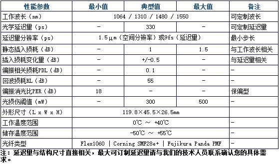 FT-VDL-MA-R-10型可变光纤延迟线是一款反射式光路手动光纤延迟线,适用于高灵敏度光纤干涉仪等应用。 采用低插损角锥棱镜、高精度的一维线性位移台与高效能旋钮调节,使系统具有极高的刚度和调节精度。 独有的光路调校技术,可确保 低插入损耗与低插入损耗变化量。高强度加强结构,提高了反射型光纤延迟 线特有的尺寸稳定性差问题,方便科研教学用户实验观察提 供定制加工,可根据客户要求对光学及手动部 分进行调整 |