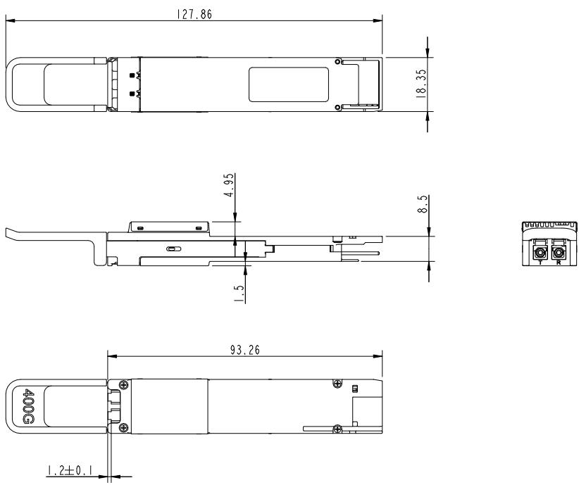 The 400G QSFP-DD ZR+ coherent transceiver Compliant with the OIF QSFP-DD MSA. Digital diagnostics functions are available via an I2C interface as specified by the QSFP-DD MSA. Mechanical dimensions, connectors and footprint conform to QSFP-DD MSA. The module is 18.35mm x93.26mmx8.50mmin size and hot pluggable by 76 PIN PAD and host connector.