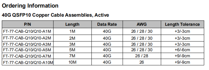 F-tone Networks active copper cables are 40Gb/s cables assembly. The cables are compliant with InfiniBand Architecture, SFF-8436 specifications and provide connectivity between devices using QSFP ports.