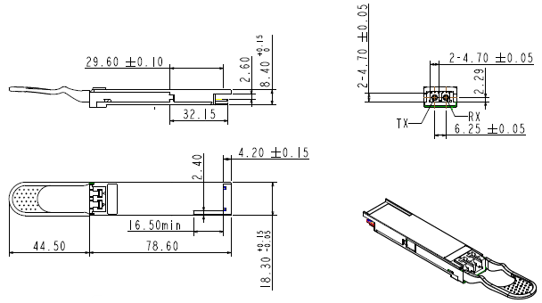 40Gb/s QSFP+ LR4,Pull-Tab,10 km on a standard single mode fiber(RX Only),-40ºC ~ +85ºC |