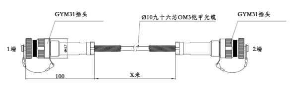 表示:两端为96芯的J599MT/26KG96BIN插头,光缆为96芯OM3铠装光纤,光缆总长30米。