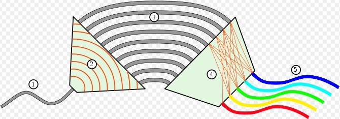 如下图,光信息在光纤1中自由传播,到达2处,进入一簇光纤中,在3中,光在多条光纤中传播,由于光纤长度不同,各条光纤中产生的相移也不同,在4处,不同光纤中光产生干涉,在每个出口通道便只有特定波长的光。正向过程是分离过程;逆向过程便是复合过程。