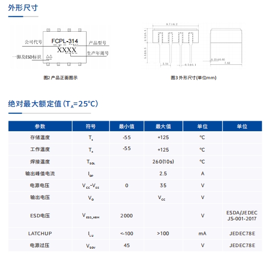 FCPL-314是一款门级驱动型光耦芯片,最大峰值输出电流可达2.5A,最大可驱动1200V/100A的IGBT 或者MOSFET,应用于电机控制和工业逆变等领域。