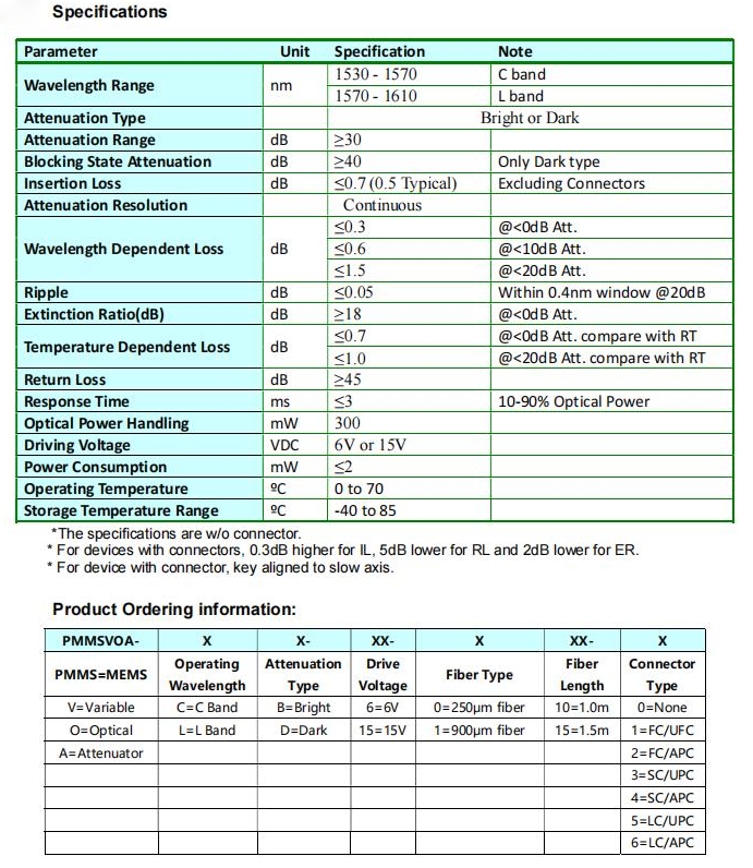 应用:多通道系统中的电源控制和均衡,EDFAs中的、增益倾斜控制、接收器保护、通道开启/关闭开关