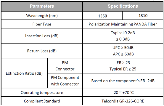 100% 经过严格的工厂控制工艺测试,符合 Telcordia GR-326-CORE,插入损耗低且消光比(ER)高