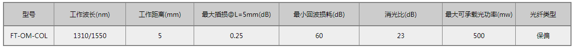 保偏光准直器将从光纤入射的保偏光信号转变为空间平行输出光束。F-tone Networks专有的磁性光学技术和先进的微型光学技术在功率处理,插入损耗,可靠性,和成本等方面提供可靠的保障。可提供客户定制的各种波长范围和各种输出光束直径的光纤准直器。