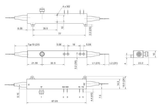 FT-46-AM20-XT and FT-46-AM40-XT have same footprints. All dimensions measured in mm. L1 is fiber length with 900 µm loose tube. L2 is length of bare fiber.
