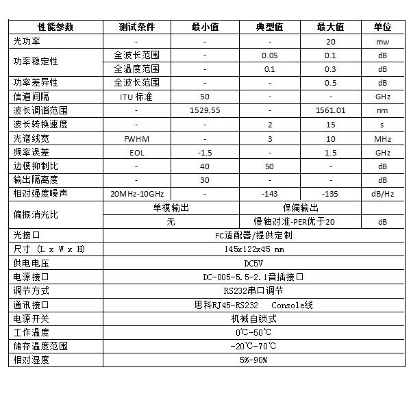 适用密集波分复用系统 最大输出功率20 mw 功率波长可调谐 集成波长锁定单元 优异的相对强度噪声(典型值-140 dB/Hz) 窄线宽(典型值3 MHz) 高边模抑制比(典型值50 dB) 保偏输出PER优于20 dB 兼容集成多通道信号传感系统 标准RS232通讯 丰富人机操作界面 |