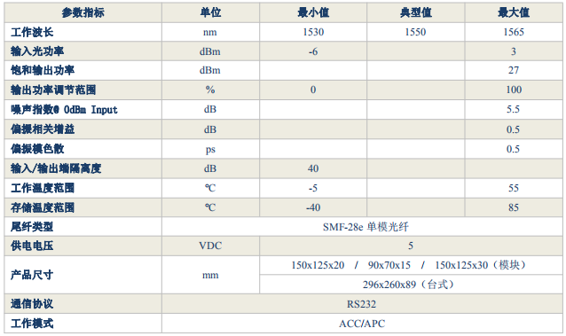 C波段功率掺铒光纤放大器是一款高饱和输出功率的功率光纤放大器(Booster-EDFA);用于对发射端信号进行放大,提高发射端光功率,提升信号的传输距离。该系列放大器内部采用优化的光路结构,配合电信级的 980nm/1480nm 泵浦激光器,实现高饱和功率放大输出。基于稳定的高效的内部控制系统, 结合高精度的 ATC 和 ACC(APC)控制电路实现放大器稳定、可靠运行。产品全部状态参量与配置信息可由上位机进行远程监控与配置。该系列光纤放大器有多种封装形式,满足不同应用要求。