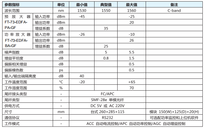 多波长增益平坦掺铒光纤放大器是专用于光纤通信系统的光纤放大器产品系列,可以同时放大C 波段内的多个波长信号,且 保持各波长间的增益一致,增益平坦度可小于1.5 dB。具有多波长、增益平坦化,以及高增益和低噪声的优点,支持上位机软 件控制,体积小巧便于集成,可提供台式或模块式封装。