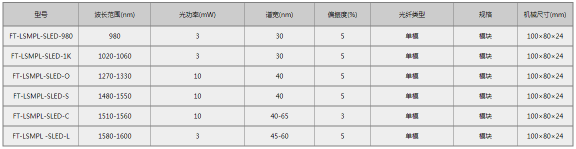 低偏振SLED光源是基于消偏技术的宽带光源,专有的光纤消偏振或晶体型消偏振技术,输出光谱具有极低的偏振度(最大值3%)。特别是对于输出光谱经过偏振器件时出现的光谱调制问题,专有的消偏技术可以有效降低光谱调制,维持SLED管芯输出光谱轮廓,适合于需要极低偏振度的应用领域,如集成光学器件测试、白光干涉仪等。