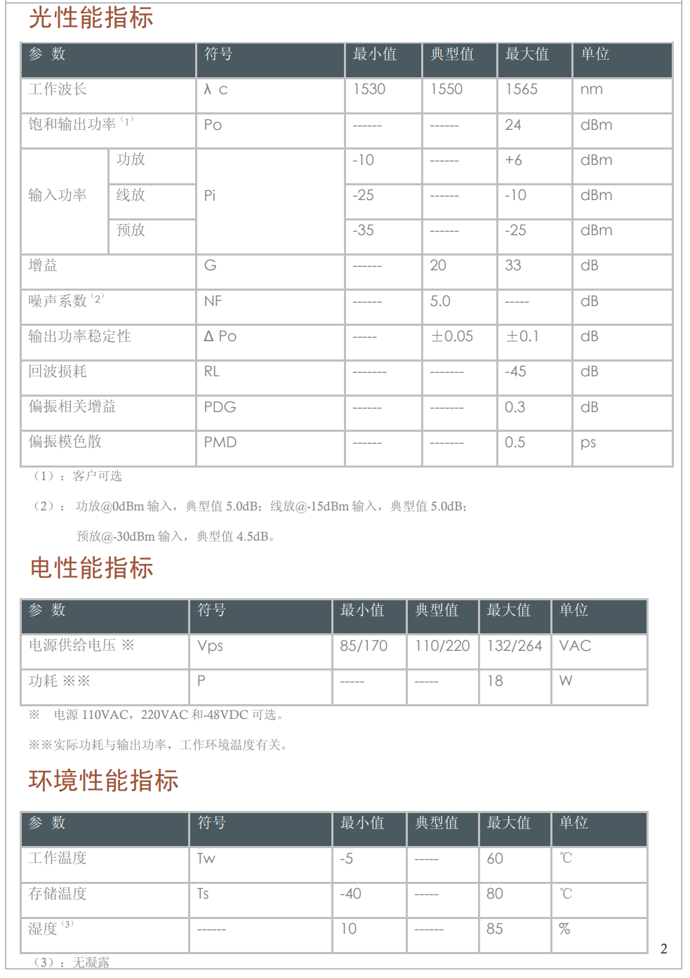 该产品为高稳定度输出 EDFA。核心器件采用高可靠性的 Pump 激光器,采用独特的 APC(自动功率控制)和 ATC(自动温度控制)电路,使得输出功率稳定度高、可靠性好;独特的光路设计保证优秀的光路指标;采用高稳定和高精度的 MPU(微处理器)系统使用调节、显示方便、可靠、智 能。 产品专为数字光纤通信系统设计的光路具有:(1)更低的噪声指 数;(2)高输出功率功放和低灵敏度的前置放大,极大提升系统链路损 耗预算;(3)宽输入功率范围和输出功率现场可调,实际工程中兼容性 更强。 双电源混插热插拔的设计,使产品成为真正的双电源产品,从而极大地提高了产品的 MTBF(平均故障间隔时间)。同时可以对机房电源系 统进行备份。 采用独创的智能温控系统,当整机温度高于 45℃时,强力风扇开始 工作,温度低于 40℃时,风扇停止。保证系统的热稳定性与风扇的长寿命。同时,专业的散热风道设计保证最优的温度稳定性。