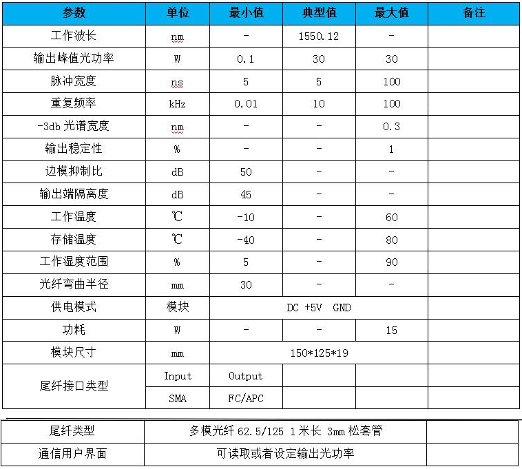DTS用光源模块已经广泛应用于DTS分布式光纤测温系统、激光测距、光纤传感等领域的应用。全新设计的纳秒级脉冲驱动电路,脉冲稳定,变形小;优化设计的低噪声掺铒光纤光路放大,实现高峰值、纳秒级脉冲激光输出,通过上位机软件,用户可以轻松操控。模块内部集成脉冲信号发生器,另外也可通过外触发信号实现脉冲输出。所有的模块经过严格的环境测试,保证了光源的长期可靠性和稳定性,非常适合系统集成。