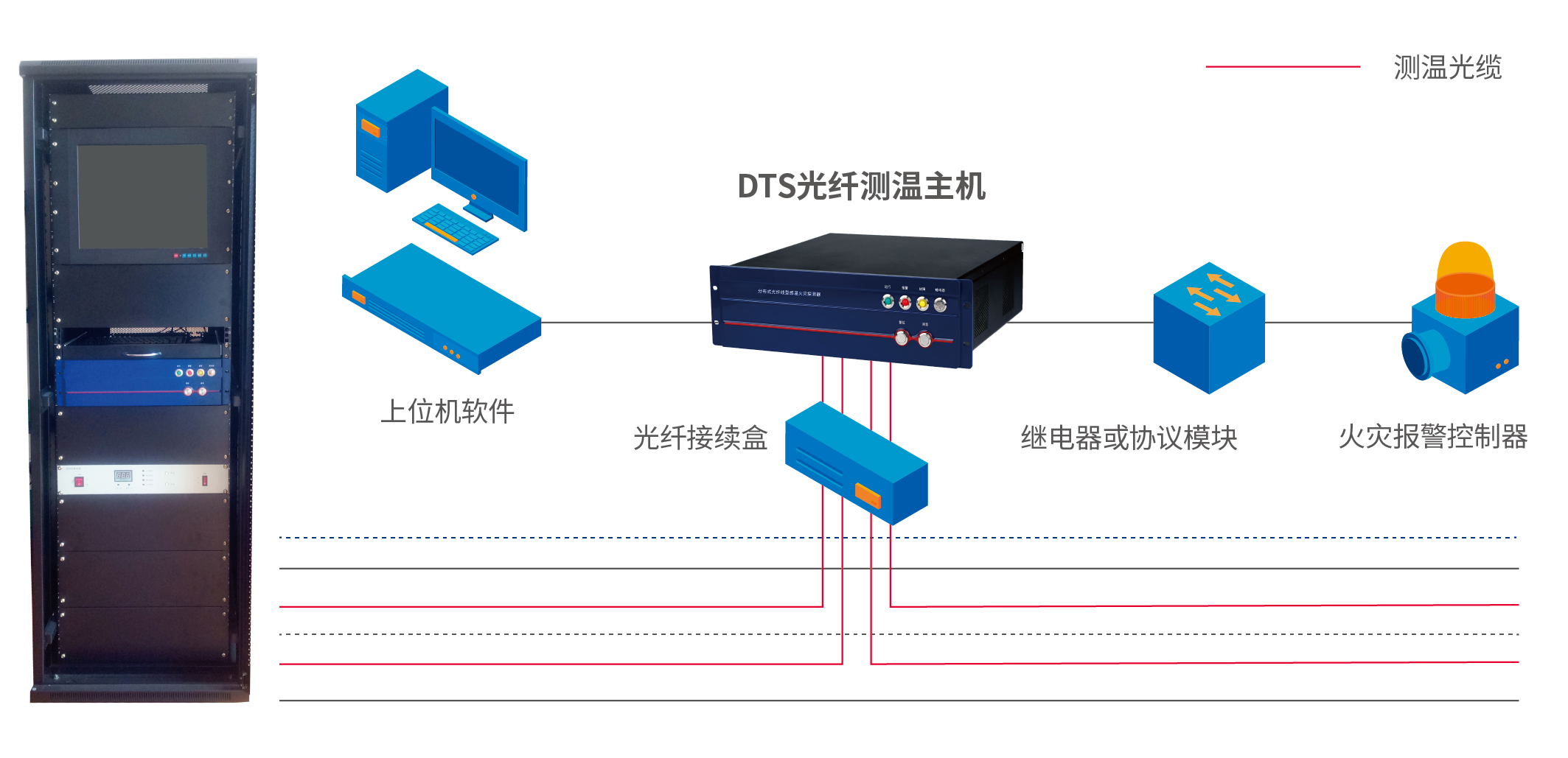 分布式光纤测温系统是一种实时、在线、连续的温度监测系统。系统基于后向拉曼(Raman)散射原理和光时域反射(OTDR)定位原理研发而成,具有光信号的发生、光谱分析、光电转换、信号放大和处理等功能,采用特种感温光缆作为温度传感器,可精确测量感温光缆铺设方向各个位置的温度并定位温度异常点,具有良好的性能指标和系统稳定性。系统集计算机、光纤通讯、光纤传感、光电控制等技术于一体,具有本质安全,耐腐蚀,不受电磁干扰等优点,连续监测长距离大范围环境温度信息,为电力、石油、交通、煤矿等领域提供优质的温度监测解决方案。
