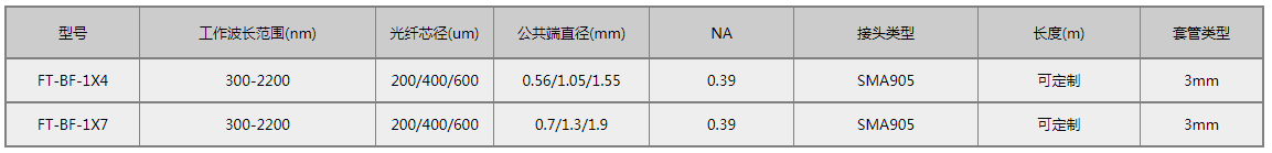 F-tone Networks的1转4扇出光纤束由4根高级光纤组成。它们在光纤束的一端呈方型或圆形排列,并且分成4个分支,每个分支中带有单根光纤。光纤束的共同端装在FT061PS黑色塑料护套的不锈钢管内,而4个单独的分支装在FT030橙色PVC分叉管内。这些光纤束可选择低羟基或高羟基的光纤,且每种可选Ø200 µm、Ø400 µm或Ø600 µm的纤芯尺寸。F-tone Networks的1转7扇出光纤束由七根高级光纤组成。它们在光纤线的一端具有环形配置,并且分支成七个分支,每个分支中带有单根光纤。光纤线的公共端装在FT061PS黑色塑料护套的不锈钢管内,而七个单独的分支装在FT030橙色PVC分叉管内。这些光纤束可选择低羟基或高羟基的光纤,且每种选择可选Ø400 µm或Ø600 µm的纤芯尺寸。