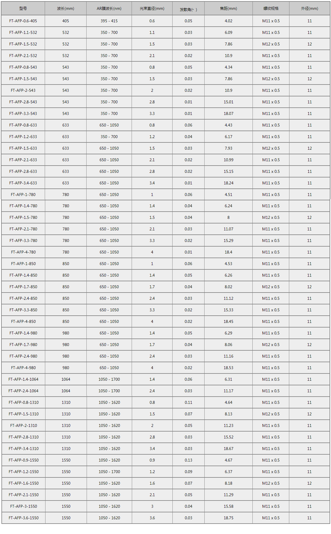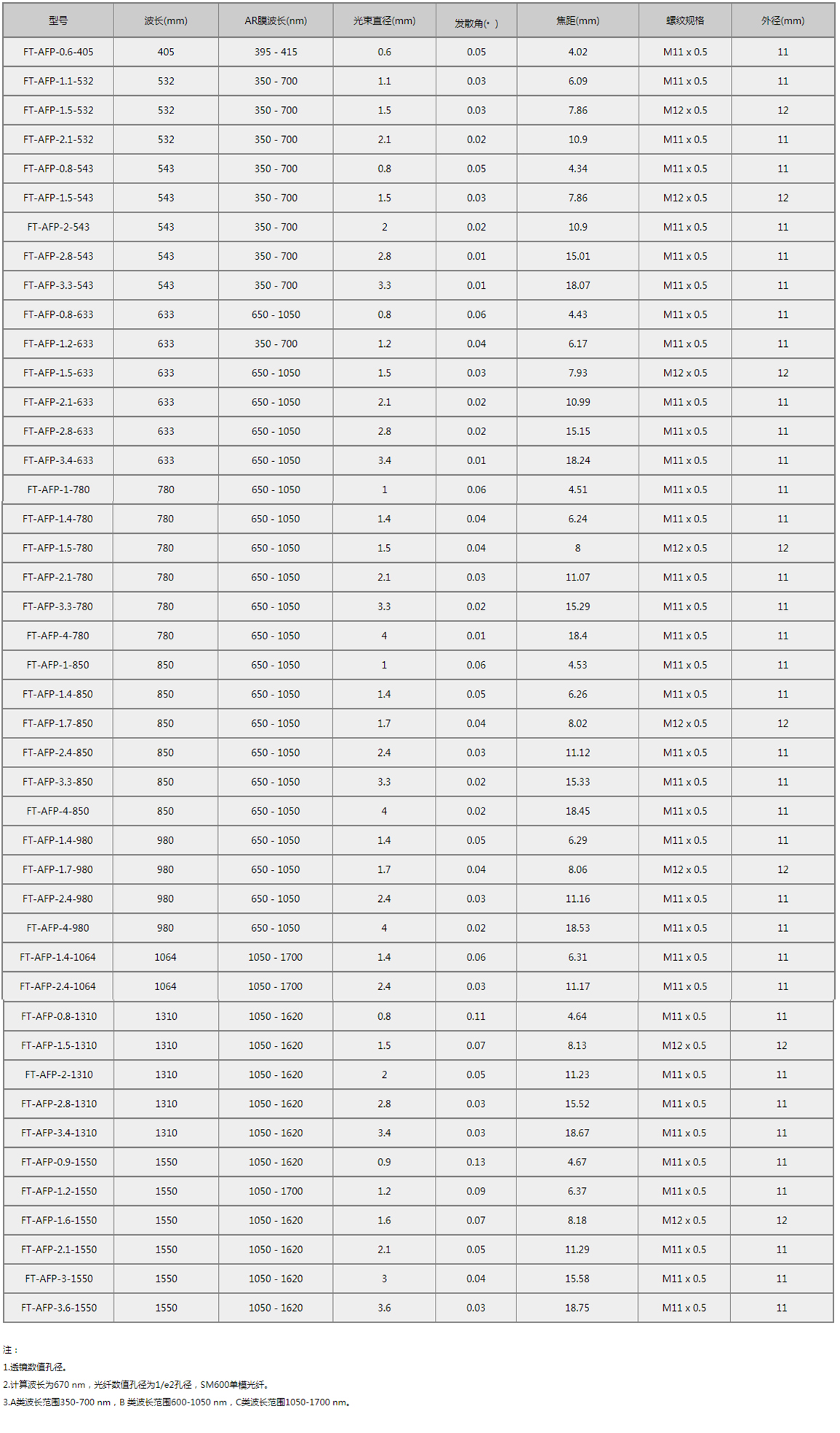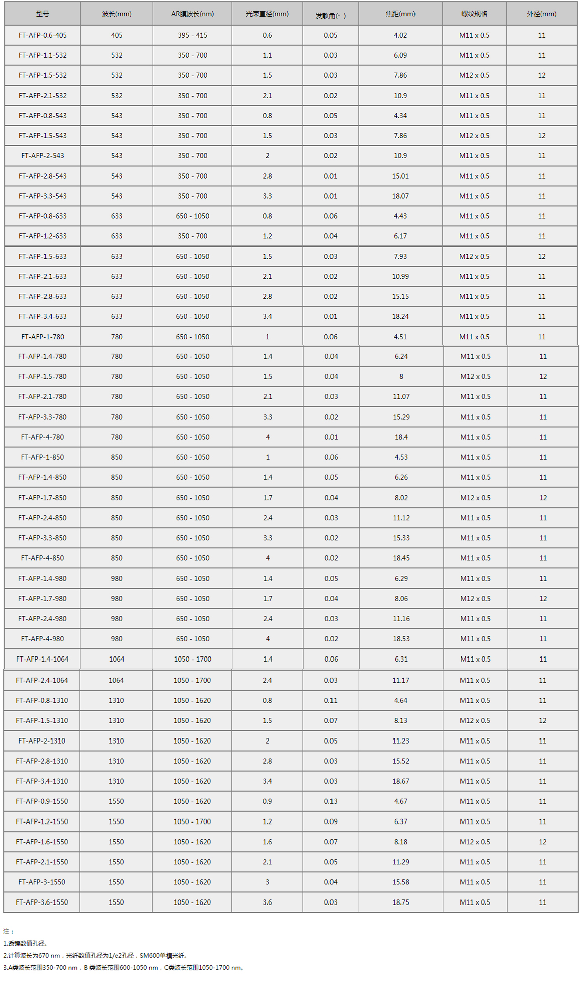 AFS型光纤准直器设计用于准直从SMA905接头光纤输出的光束,出厂经预对准,具有衍射极限的性能。光纤准直器内部无运动部件,结构紧凑,方便集成到已有的装置中。由于非球面透镜会产生色差,所以有效焦距(EFL)与波长有关。透镜两面均镀有增透膜,最大限度地减少表面反射。虽然这些准直器设计用于单模光纤跳线,但也能用于小芯径、低NA的多模光纤跳线。为了提高性能,我们建议将这些准直器与镀增透膜的多模光纤跳线配合使用。这些跳线在光纤的一端镀有增透膜,以在光纤与自由空间界面上提高透射率,并改善回波损耗。需要说明的是,AFS型准直器仅在与单模光纤一起使用时才能保证性能规格。