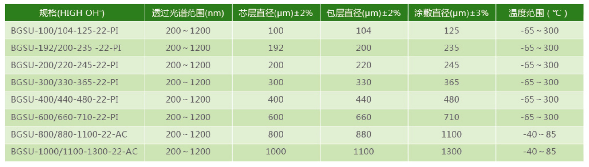 紫外光优化多模光纤基于全石英光纤结构,100-1000um多种芯径可选,按照芯径比例1:1.1或者1::1.04的包层直径比例,提供AC,UV,氟化丙烯酸酯,传统树脂等多种可选涂覆层。0.22.0.37,0.39,等不同的数值孔径-兼容绝大部分激光二极管的耦合光纤,出色的几何尺寸一致性和纤芯/包层同心度-易于和泵浦激光二极管耦合。