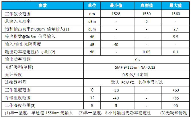 北亿纤通的高功率EDFA产品输出光功率高达27dBm,已经广泛应用于光纤传感、光纤通讯领域。EDFA使用980nm或者 1480nm 的泵浦激光器提供能量,内部采用 AGC、ACC 或者 APC 的控制方式。产品具有输出光功率高、光谱范围宽以及增益大范围可调(>20dB)等优点。北亿纤通 的 EDFA 分为 C 波段,L 波段两种产品,可以满足客户的多种需求。北亿纤通提供的高功率EDFA使用DC+5V/GND电源输入,使用灵活的人机接口形式,通过RS232串口可以方便设置EDFA内部参数,实现模块内的实时参数监控,实现线路远程管理和控制。