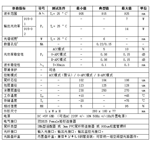 高输出光功率(7W+7W) 支持单泵浦或双泵浦激光器 105/125um多模光纤输出 内置高效率自动温度控制电路(ATC) 内置大电流激光器驱动电路 支持自动恒电流工作模式(ACC) 支持外部光反馈自动功率控制模式(O-APC) 支持外部电反馈自动功率控制模式(E-APC) 微处理器智能控制 完备的状态显示与告警显示 内部状态参量实时监控(可选) 一键关机紧急故障处理模式 墙电/风冷 操作简便 |