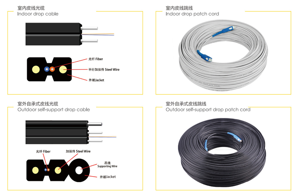 皮线光纤跳线的分类,根据光缆结构分为室内皮线光纤跳线,室外自承式皮线光纤跳线两种。