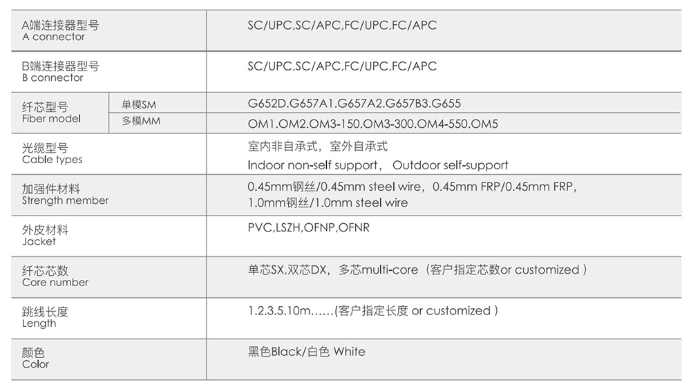 皮线光纤跳线是一款专用用FTTH光纤入户终端的专用跳线,又名预制成端蝶形引入光缆。其特点是,采用蝶形皮线光缆,LSZH或者PVC外护套保护。两根平行FPR或镀锌钢丝加强件,提供足够拉力和抗压力。耐弯曲光纤,提供更大的带宽,增强网络传输特性。光缆重量轻,体积小,防雷,防鼠,和防水,以及独特的凹槽设计,方便接续安装和维护。