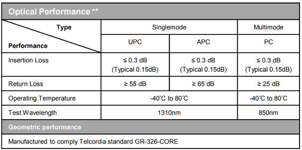 - 100% 经过严格的工厂控制工艺测试,符合 Telcordia GR-326-CORE,插入损耗低