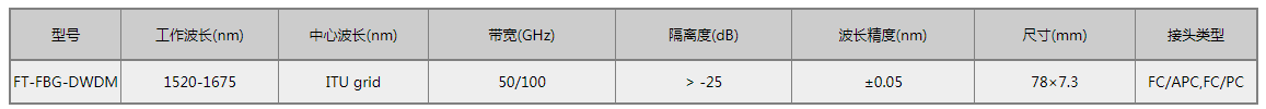 50/100G DWDM光纤光栅是专门用于DWDM波长密集型光纤传输系统中,优异的波长稳定性是系统能够稳定的工作。波长间隔50G、100G可选,此器件也可用于生产制造密集型波分复用。