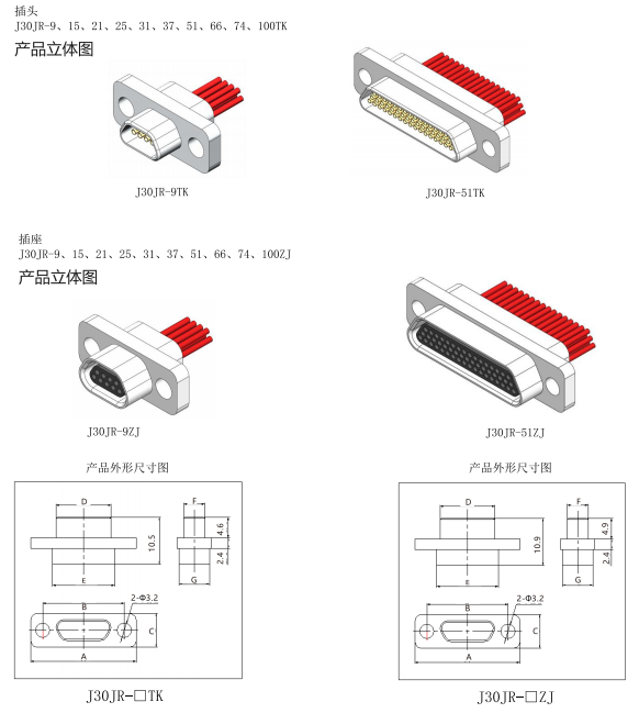 J30JR反装系列产品为捕头装插孔,插座装插针,与J30JR-TJ/ZK正好相反,导线序号(孔位)也与之相反;该系列产品形式有压接、焊接、直插印制板、弯插印制板,外形同普通基本型产品;用户应根据设备的安装方式选择锁紧组件,并在订货型号中注明,具体说明参考“附件说明 ”: