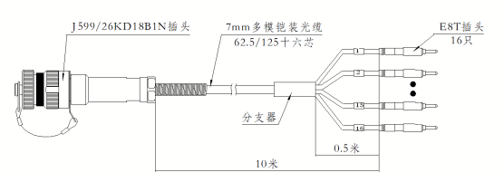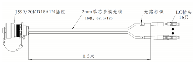 型号说明:左端为 J599/20KD18A1N 插座,右端为 16 只 LC 插头,使用φ2 单芯多