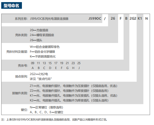 J599/OC系列光电混装光纤连接器是在J599系列光纤连接器基础上,将部分光接触件改成电接触件,能同时连接光纤、电导线两种介质的混装连接器。