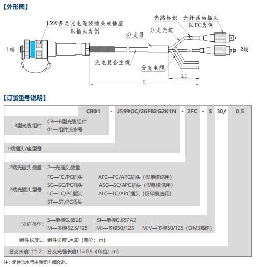 表示:J599系列B型光缆组件,组件1端为J599OC/26FB2G2K1N插头,2端为2个FC/PC插头,光纤传输模式为多模50/125 OM3,组件长度L为30m,分支长度为0.5m。