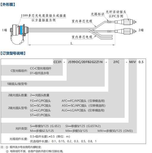 表示: J599系列C型光缆组件,组件1端J599OC/20FB2G2Z1N插座(不带尾部附件),2端为2个FC/PC插头,光纤传输模式为多模50/125(OM3),组件长度L为0.5m。
