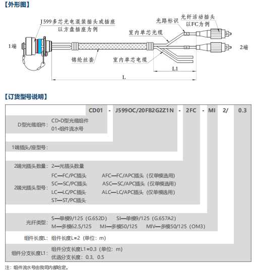 表示:J599系列D型光缆组件,组件1端J599OC/20FB2G2Z1N插座(不带尾部附件),2端为2个ST/PC插头,光纤传输模式为多模50/125,组件长度L为2m,分支长度L1为0.3m。